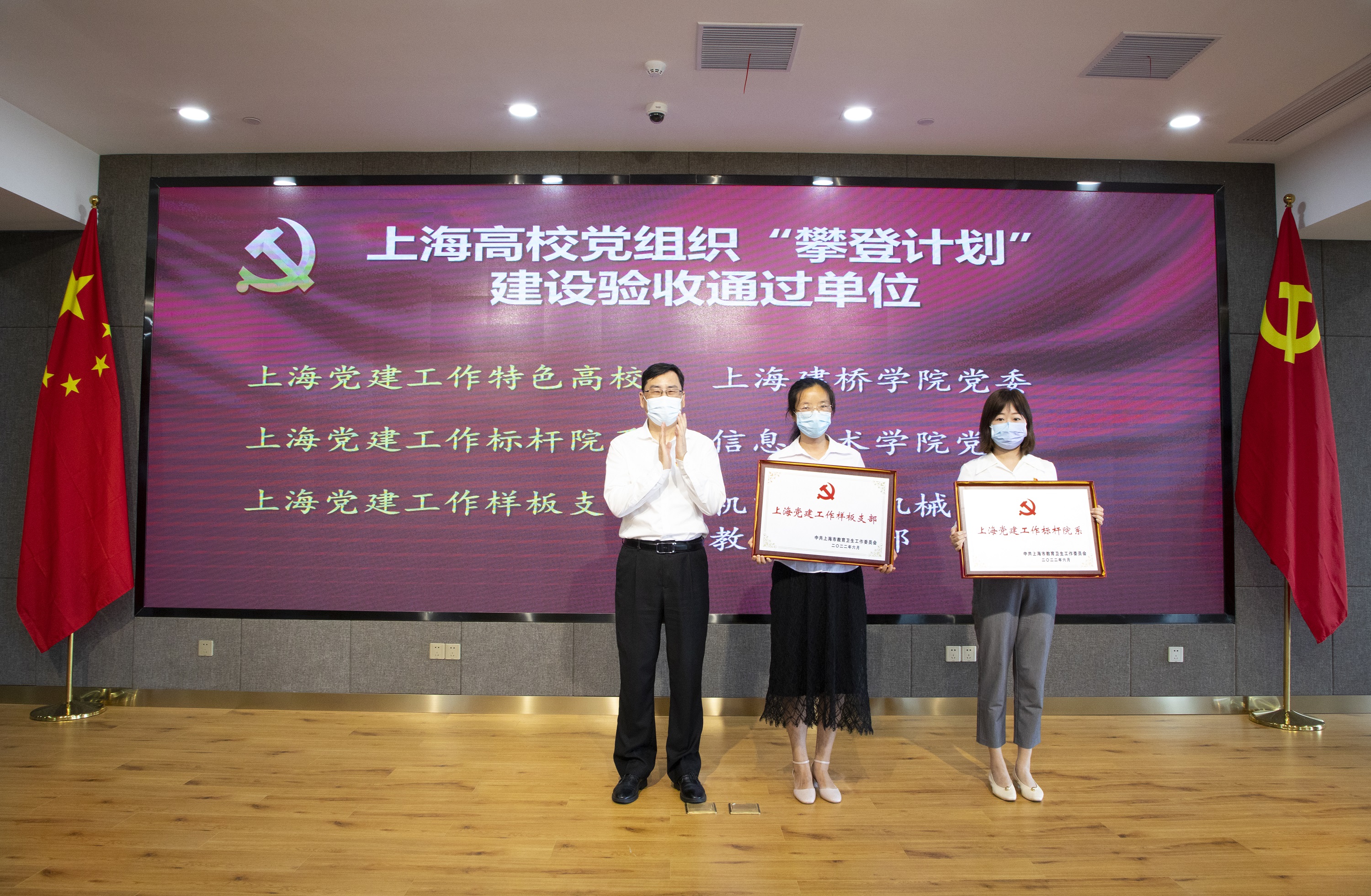 朱瑞庭校长为上海高校党组织“攀登计划”建设验收通过单位授牌。2018年我校被列入上海高校党组织“攀登”计划,成为上海党建工作特色高校建设单位,信息技术学院党总支被列为上海高校党建工作标杆院系建设单位,机械电子系教工党支部被列为上海高校党建工作样板支部建设单位。