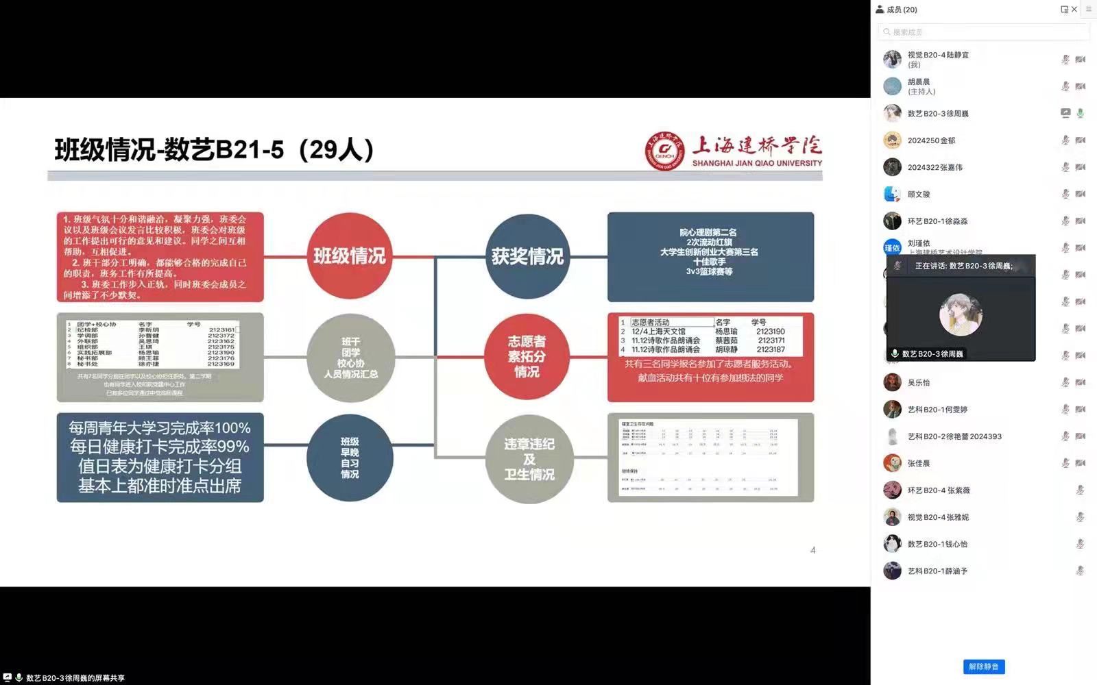 答辩会上,每位答辩成员主要围绕两方面内容进行3分钟的PPT集中展示。一是个人本学年的学习、生活、工作情况以及在工作岗位上的收获、不足和今后努力方向;二是班级班风学风存在的不足以及下学期的工作计划。答辩过程中,评委老师重点围绕班级主要干部如何发挥模范带头作用,如何处理好班委一体化建设,如何结合专业和班级特点优化日常管理、增强班级活力等方面进行了提问。