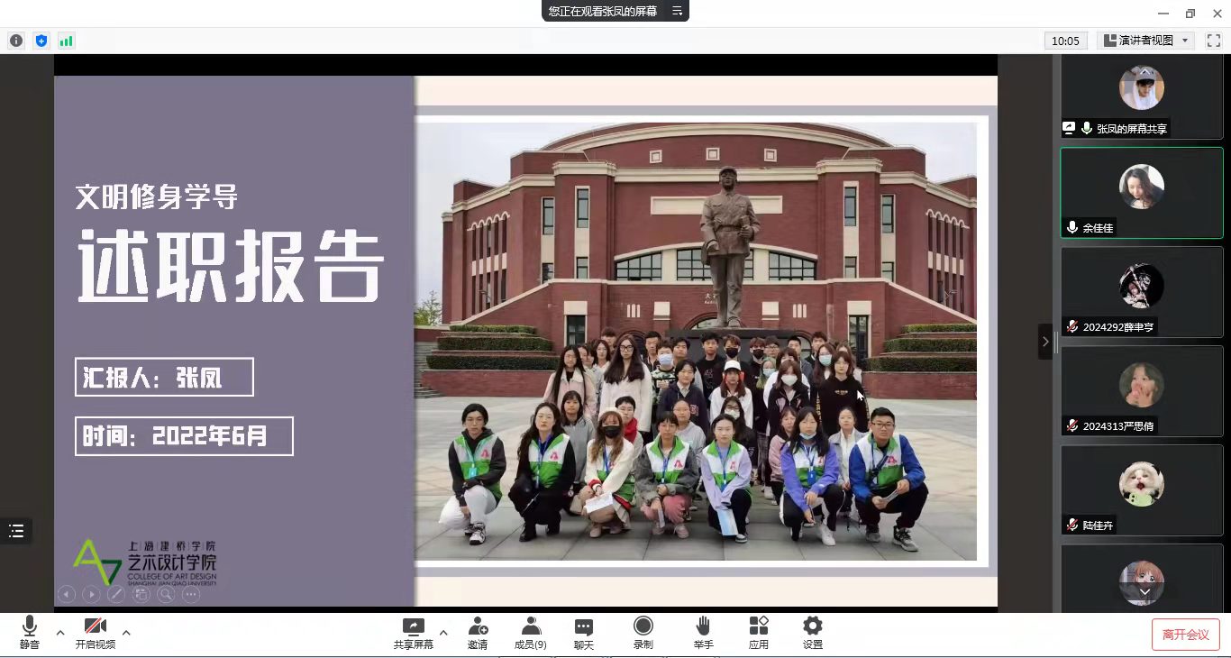 为进一步强化学院学生干部队伍建设,提升学生骨干的责任意识,增强其工作积极性,促进班级间相互学习、共同进步,艺术设计学院分别于6月30日、7月1日、7月4日和7月5日开展了2021-2022年度学生骨干述职答辩会。学院文明修身学导、劳动课助理、辅导员助理以及各班班长、团支书、考勤班长、社区班长、学习委员参加此次答辩大会,艺术设计学院全体辅导员参会并进行评议与指导。