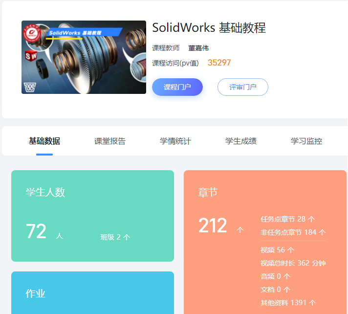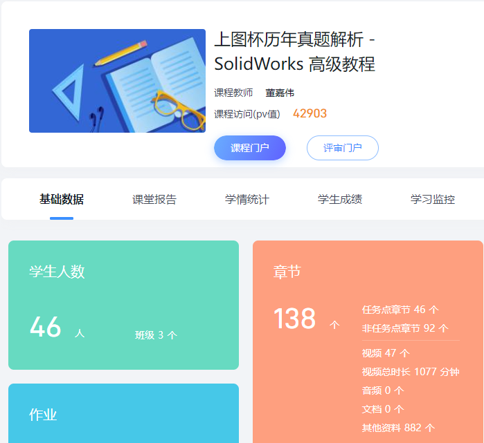 为了让学生指导梯队的压力降低,同时使指导老师的作用得到更加极致的发挥,还利用超星学习通,建设了两门竞赛指导课程,分别是《Solidworks 基础教程》以及《上图杯历年真题解析-SolidWorks高级教程》,共计1400分钟的视频录制,累计课程访问量达78200次。比赛每周的全体例会,更是让学生能够将每周遗留下来的问题,得到有效的解决。