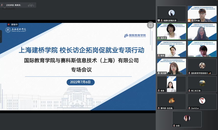 为贯彻落实党中央、国务院“稳就业”、“保就业”决策部署,积极响应学校号召,持续推进学院毕业生就业工作,7月6日下午,国际教育学院召开校长访企拓岗促就业专项行动——赛科斯信息技术(上海)有限公司专场会议。陈伟副校长,国际教育学院院长梁月泉、党总支书记周英芬、副院长刘潇滢、党总支副书记高祺、日语教学中心主任杨晓兴、网络工程专业副主任王瑞、院办主任张文静及相关专业辅导员,赛科斯信息技术(上海)有限公司人事部经理张佳胤、人事部招聘主管左聪参加会议。会议由党总支书记周英芬主持。