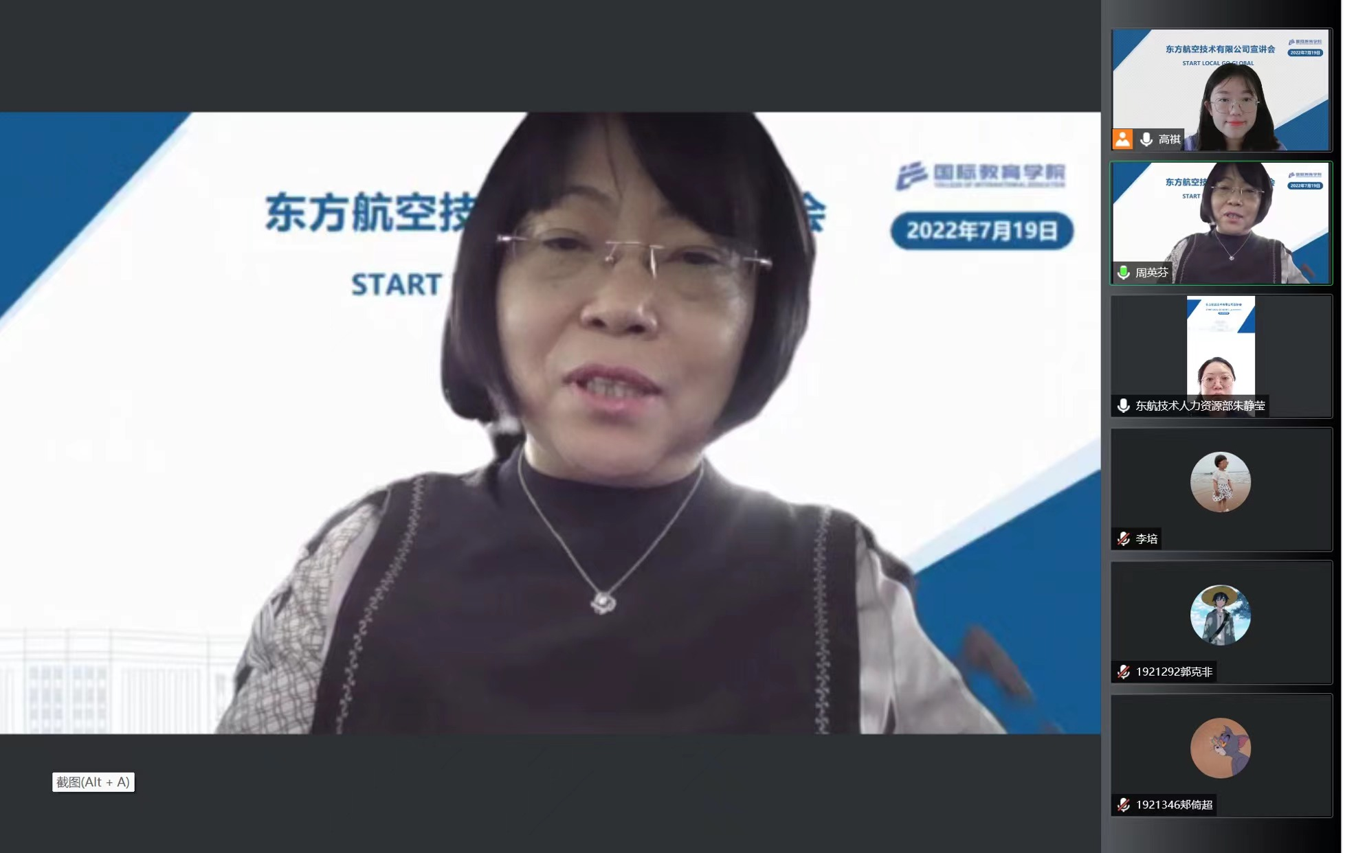 7月19日上午,东方航空技术有限公司通过视频会议形式为国际教育学院2022届毕业生、2023届部分专业毕业生开展线上宣讲会。我院党总支书记周英芬、副书记高祺、机械设计制造及其自动化(中外合作办学)专业主任李培、辅导员孙莉、付柯嘉等老师出席,东方航空技术有限公司人力资源部朱静莹经理做宣讲。会议由高祺副书记主持。