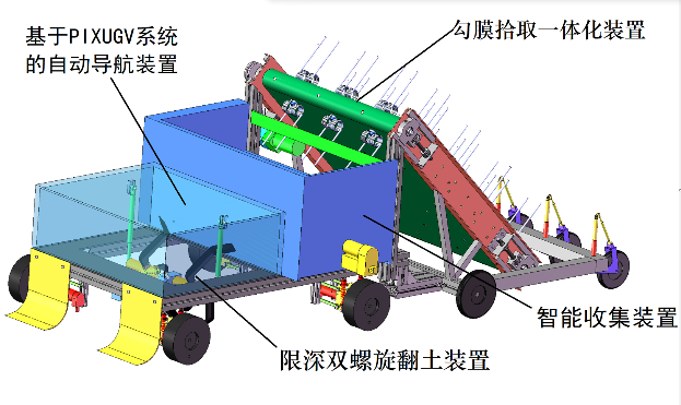 项目介绍:本作品是农业地膜残膜智能抽取装置。针对我国由于地膜造成的白色污染严重、残膜回收成本高、残膜难以有效清除、小型种植土地无法使用大型机器的问题。本小组设计了由基于PIXUGV系统的自动导航装置、勾膜拾取一体化装置、智能收集装置、限深双螺旋翻土装置四部分于一体的残留地膜智能抽取装置。