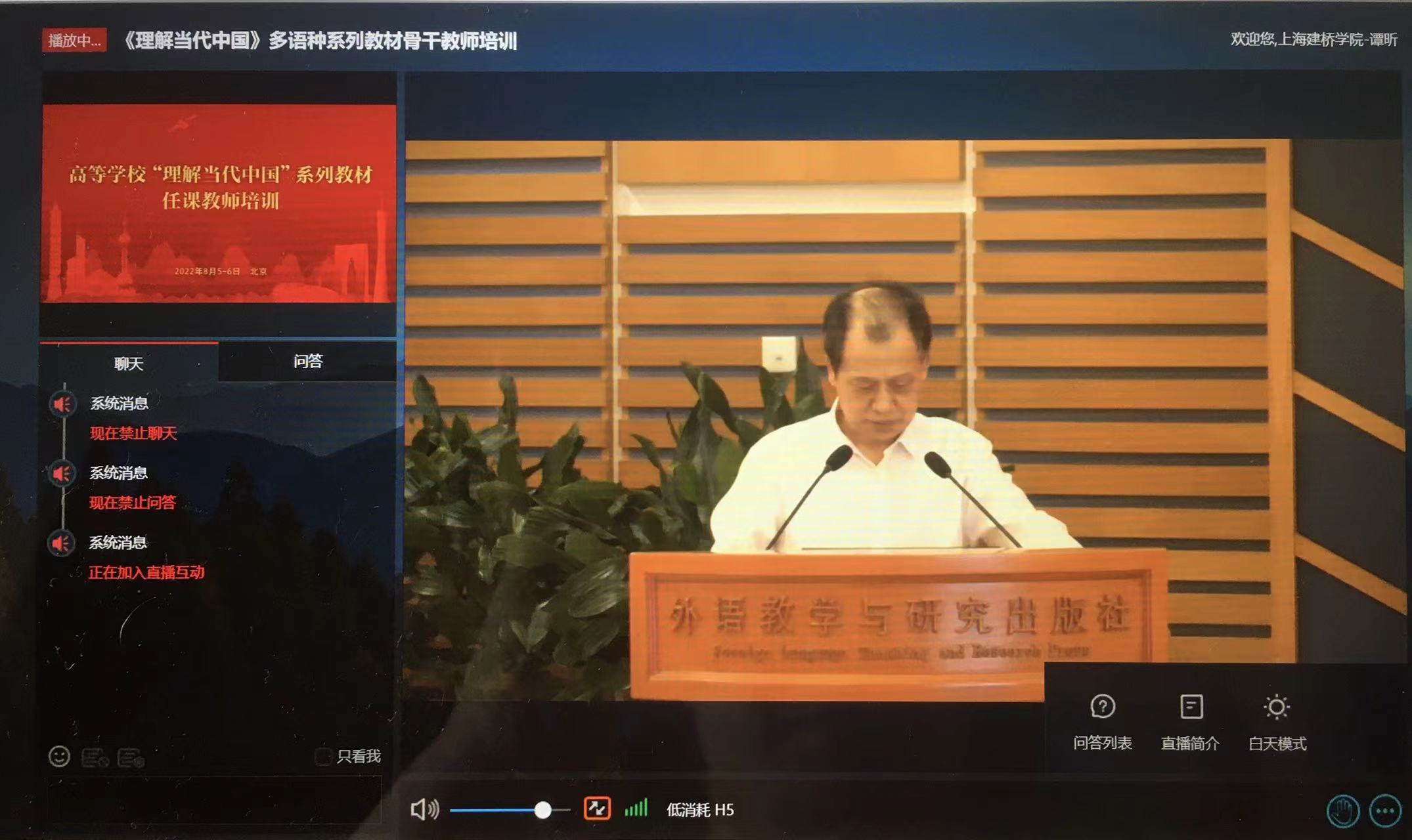 本次培训旨在全面推进由中央宣传部、教育部组织编写的《习近平谈治国理政》多语种版本系列教材进课堂工作,帮助各高校外语任课教师准确把握《理解当代中国》系列教材主要精神和重点内容,更好地把“理解中国,讲好中国故事,把中国介绍给世界”这一重要的立德树人教育目标融入于教学之中。《理解当代中国》系列教材涵盖英语、俄语、法语、日语等9个外语语种和国际中文系列教材,课程包括读写、演讲辩论、翻译等4门。此次培训内容围绕“三进”工作总体要求,深入学习习近平新时代中国特色社会主义思想,系统学习《理解当代中国》系列教材的整体理念、教学要求和教学示范等,切实提升“三进”教学工作实效。主要分为三大主题板块,5日培训内容主要为领导及教材编写专家所做的整体教学原则指导,以及习近平新时代中国特色社会主义思想专题培训。6日培训内容则侧重日语教材的教学理念与教学方法的示范。