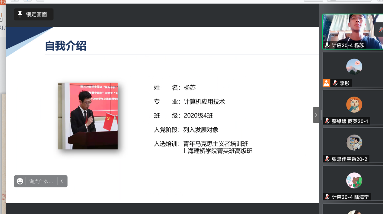 答辩会上,12位候选人从学习成绩、社会实践、创新能力及文体竞赛、主要荣誉几方面进行演讲和PPT展示。柯翔祯同学成绩优异,多门课程达到满绩点,积极参与校内外志愿活动,在思想上和行动上不断向党组织靠拢;杨苏同学不断突破自我,追求卓越,在社会实践、创新创业、志愿服务等方面有着优异表现,得到了评委们的一致认可。