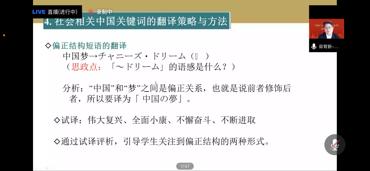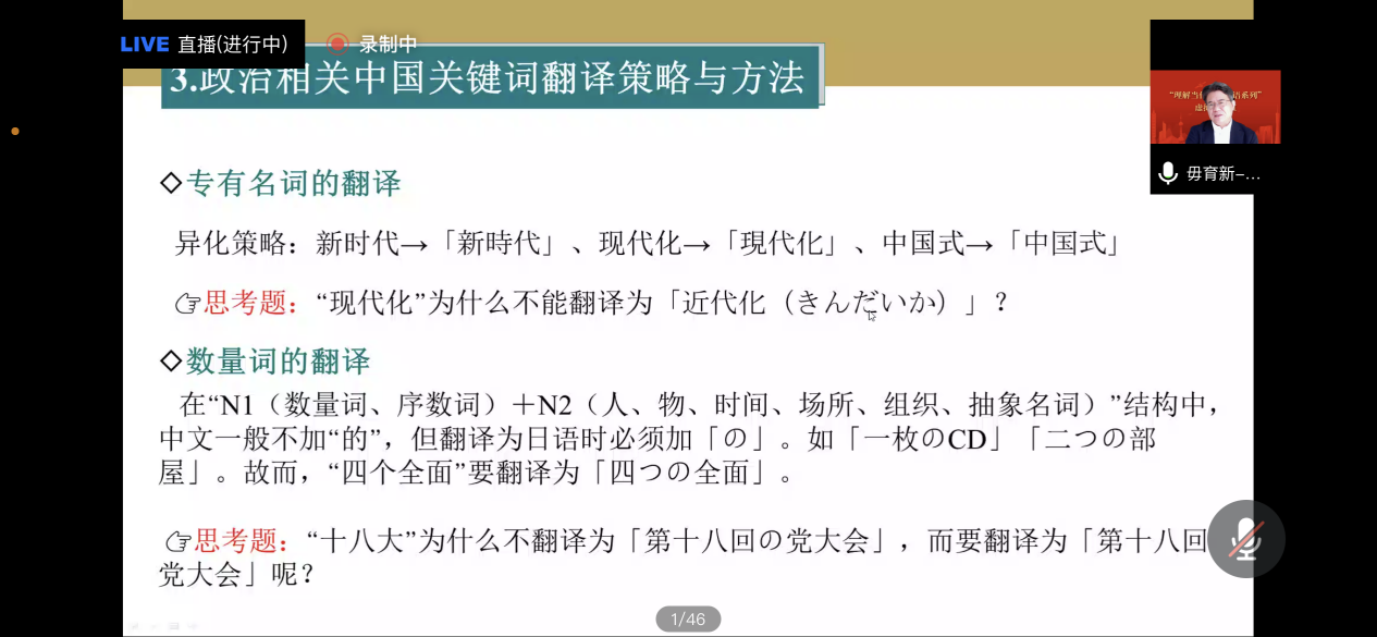 9月25日(周日)上午,“理解当代中国”日语教材虚拟教研室活动第1期在腾讯会议上举行。“理解当代中国”日语系列教材总主编、天津外国语大学修刚教授担任牵头人,特邀《汉日翻译教程》副主编、西安外国语大学毋育新教授进行教学展示,结合《汉日翻译教程》第1单元和第2单元的具体内容,对翻译课程的教学设计思路进行了解说。上海建桥学院外国语学院日语系主任刘尔瑟、日语系教师李熙颖参加本次虚拟教研室活动,深入学习“理解当代中国”日语系列教材的内涵,明确了“三进”工作的重要战略意义,并参与了集体备课。