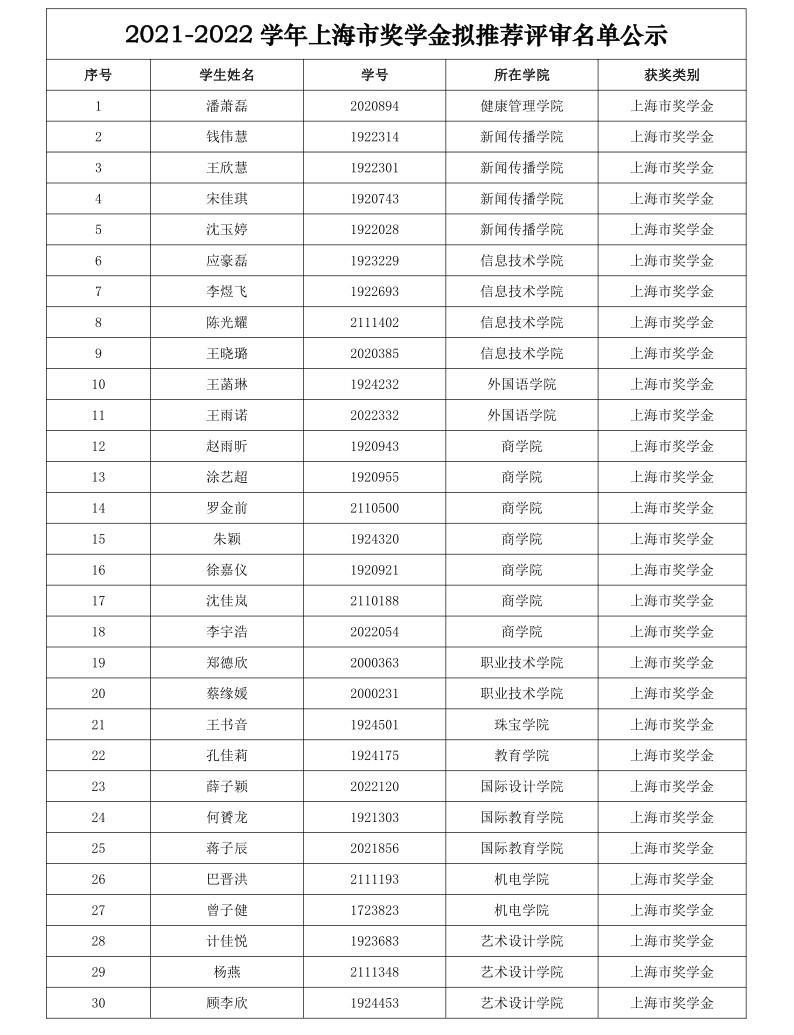 2021-2022学年国家奖学金、上海市奖学金拟推荐评审名单公示