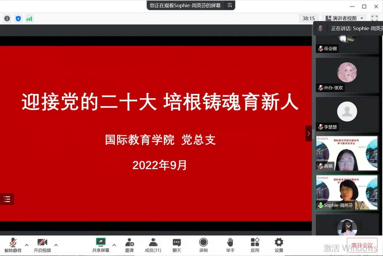 接着,周英芬书记详细介绍了《上海建桥学院师德师风建设月活动实施方案》和《国际教育学院2022年师德师风建设月活动实施方案》,强调学院深入开展师德师风建设的重要性和意义。随后,周英芬书记领学了《学习习近平总书记关于师德师风的重要论述》,引导广大教职工争做“四有”好老师,为培养德智体美劳全面发展的社会主义建设者和接班人贡献力量,以实际行动和优异的成绩迎接党的二十大胜利召开。