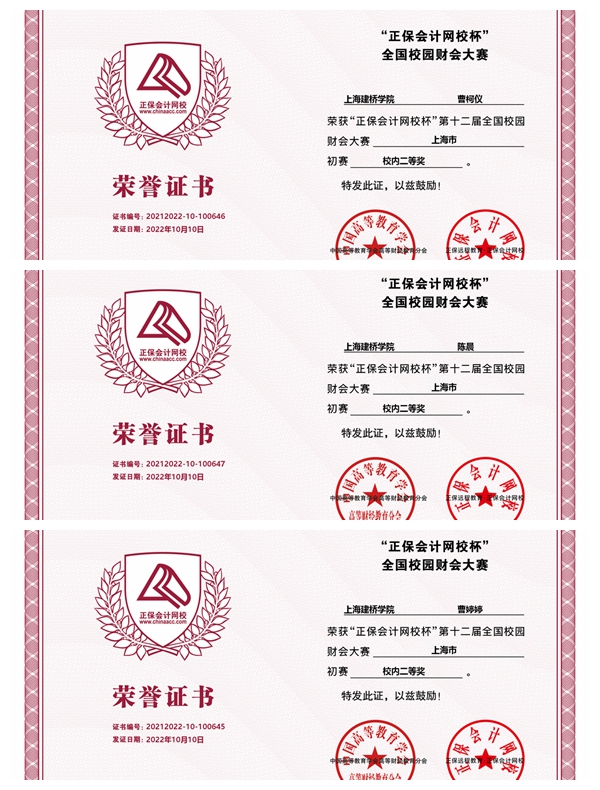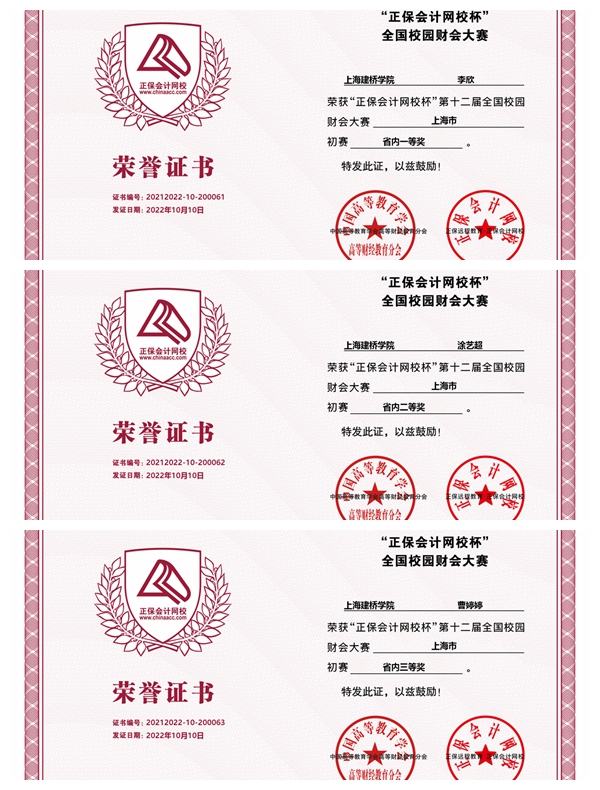 近日,“正保会计网校杯”第十二届全国校园财会大赛校园初赛落下帷幕。商学院会计系同学克服疫情重重困难,经过激烈竞争角逐,喜获佳绩并成功晋级全国复赛。其中,李欣、涂艺超、曹婷婷同学分别获得上海市一等奖、二等奖、三等奖。李欣、涂艺超同学获得校内一等奖,曹婷婷、曹柯仪、陈晨同学获校内二等奖,徐心怡、吴越、秦慕榕、倪星宇、陈堰琳同学获校内三等奖。指导老师黄怡婕、徐洁、刘姝获优秀指导教师奖。