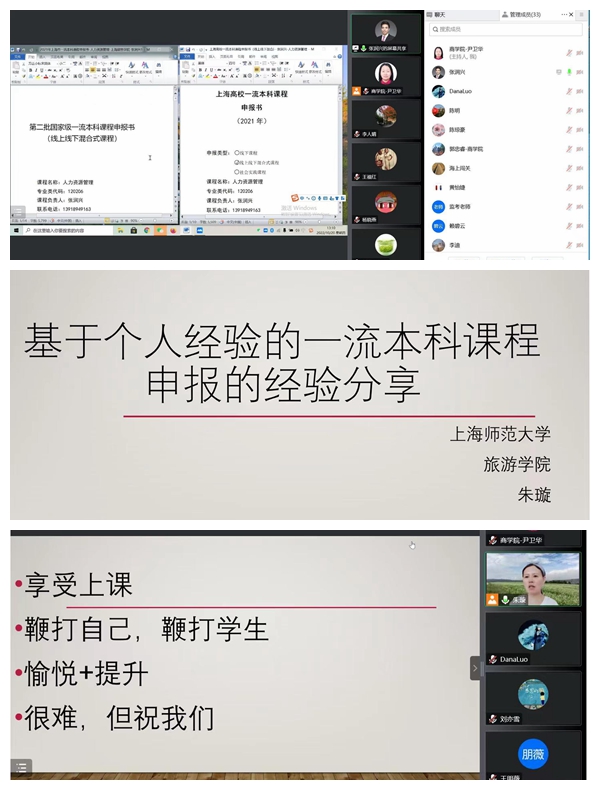 商学院张润兴老师主讲的《人力资源管理》被认定为2021年度上海市一流本科课程(线上线下混合式)。10月20日,张润兴老师以《人力资源管理》为例详细讲解了市一流课程的申报方法,并指出申报书的内容实际反映了任课老师对课程的整体设计、课程网络资源的建设,以及日常教学过程等,因此任课教师需要对课程教学的整个过程进行记录、整理,反思并改进,为一流课程申报打下扎实的基础。
