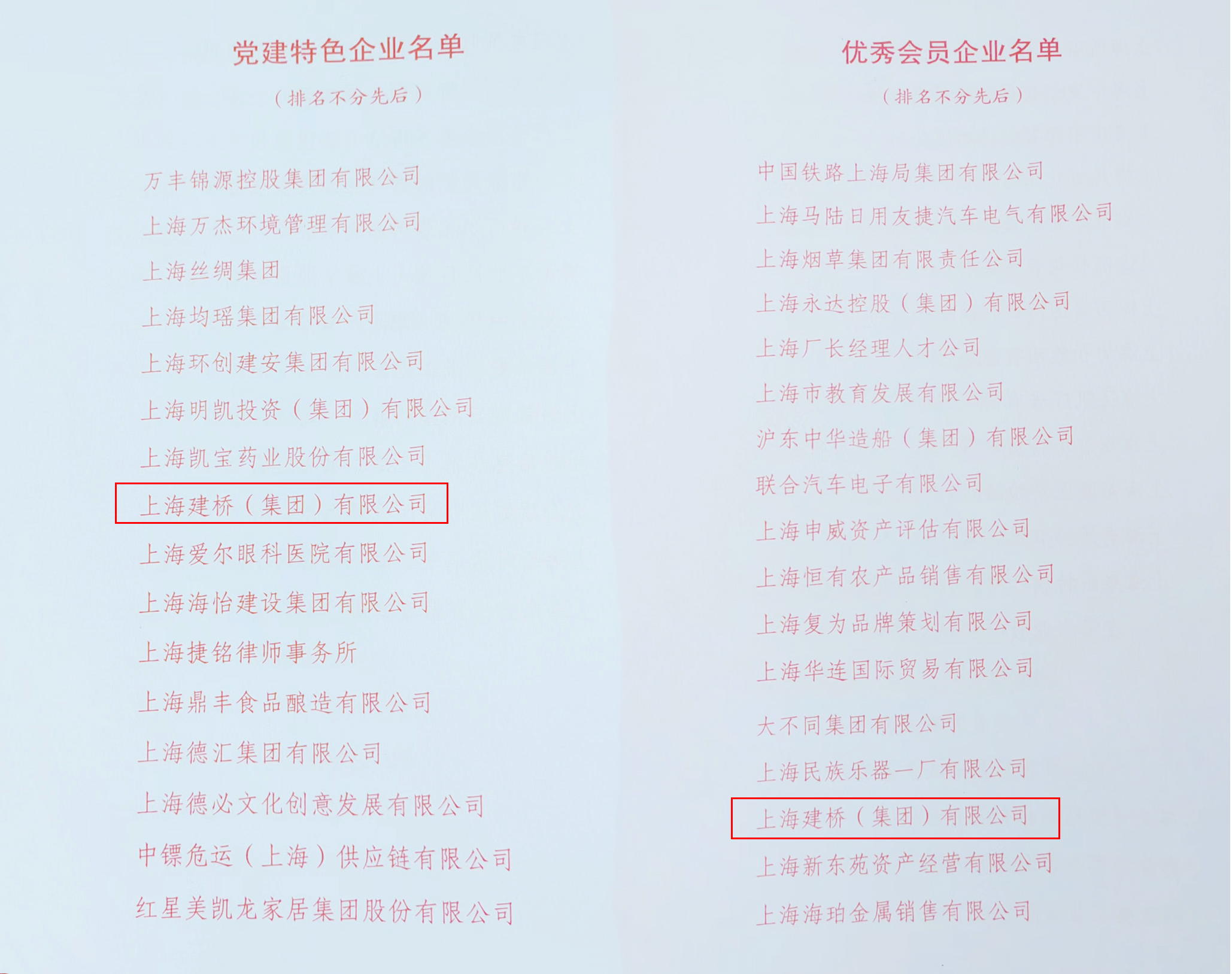 近日,上海市企业联合会传来喜报,上海建桥(集团)有限公司荣获由上海市企业联合会和上海市企业家协会联合颁发的“优秀会员企业”和“党建特色企业”称号。