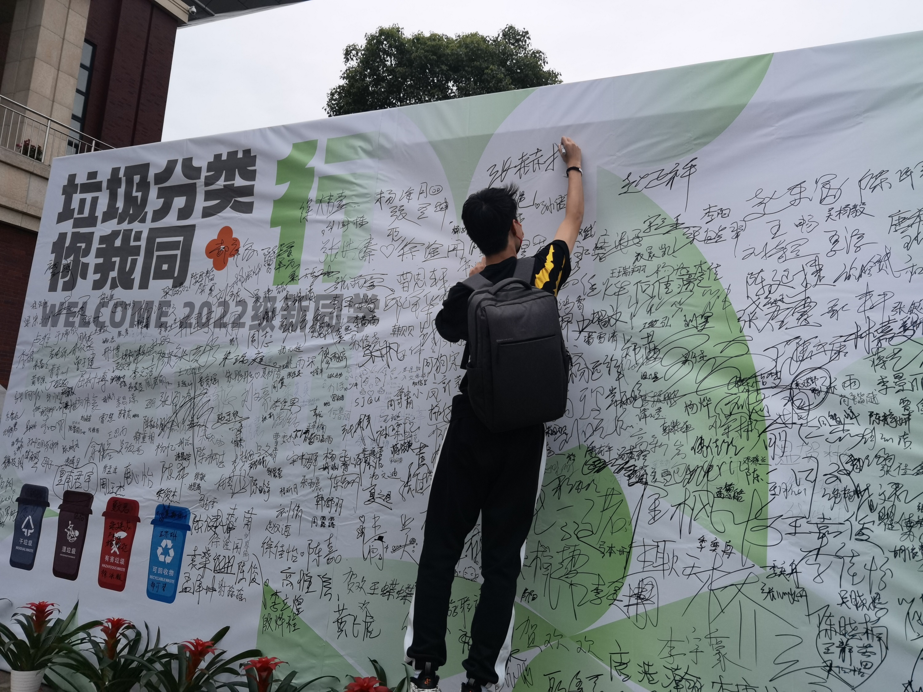 为帮助广大新生了解上海市垃圾分类要求,养成垃圾分类的良好习惯,全面推进垃圾分类工作,进一步加强校园生态文明建设,2022年10月7日至9日,上海建桥学院后勤保卫处在2022级新生报到环节同步开展以“垃圾分类,你我同行”为主题的垃圾分类减量宣传及签名寄语活动。