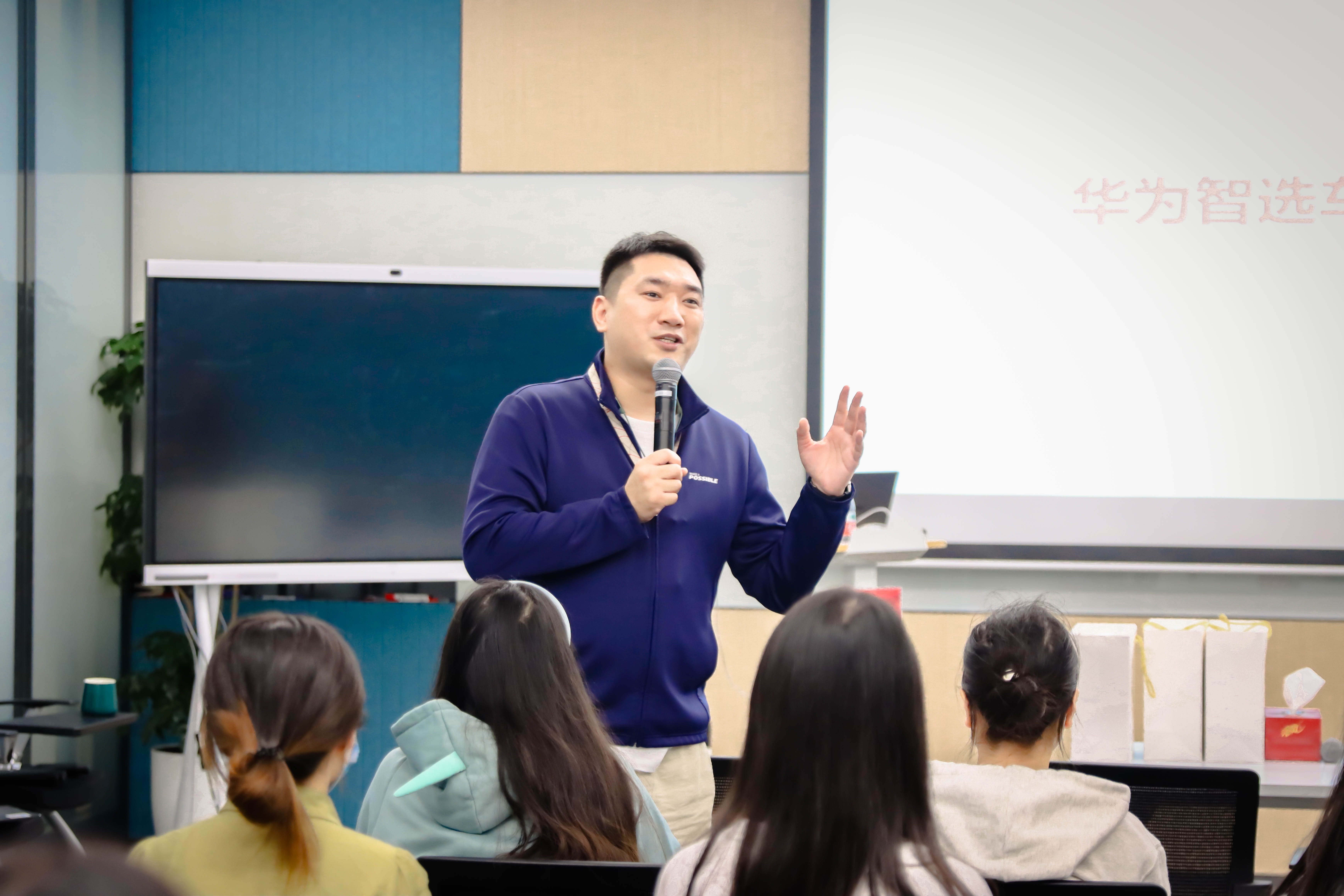 深圳慧通商务有限公司大中华终端智选车业务零售培训负责人张凯明先生、HR齐敏捷女士、HR陈婷女士介绍了华为的创建经历、现今实力以及慧通商务有限公司的经营情况和特点,展现了当前华为在国内外零售建设取得的巨大成就。公司员工带领学生参观了华为智能展厅,并为师生介绍了当前华为终端的业务线,包括了在全场景生态战略发展下的手机、电脑、平板、可穿戴设备、移动宽带终端、新能源汽车等消费者智能业务,并邀请学生进行互动体验。