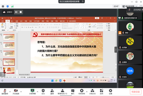 2022年12月7日,艺术设计学院理论学习中心组开展党的二十大报告学习活动,党总支书记周智明就《推进文化自信自强,铸就社会主义文化新辉煌》进行主题宣讲,艺术设计学院理论学习中心组成员参会学习。