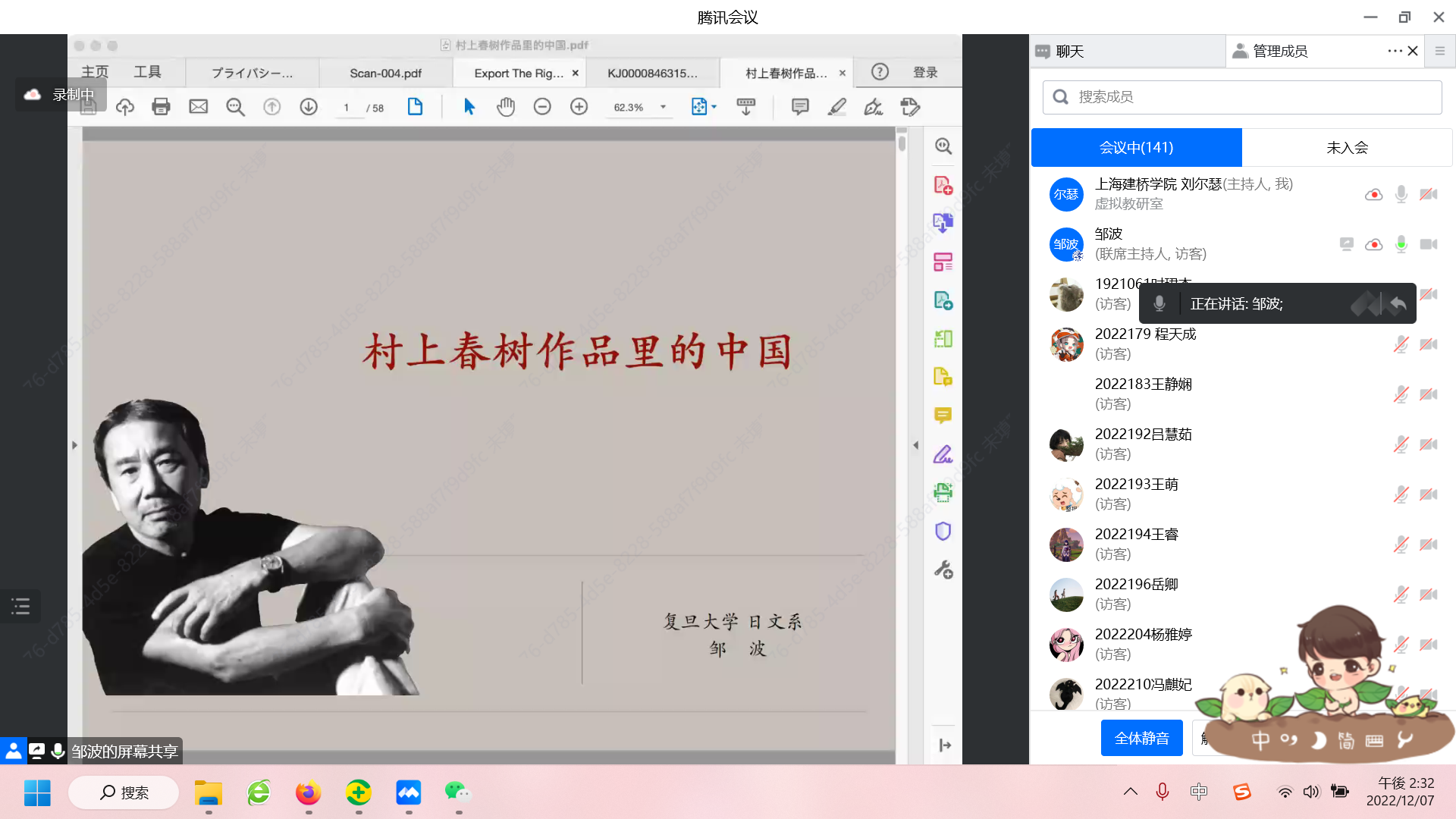 2022年12月7日下午,外国语学院日语系有幸邀请到复旦大学外文学院日文系主任、中国日语教学研究会上海分会副会长、中国日语教学研究会常务理事邹波副教授为我校外国语学院日语系20级、21级、22级约150名同学进行了题为“村上春树作品里的中国”的学术讲座。本次讲座由外国语学院与科研处共同举办,由日语系主任刘尔瑟老师主持。