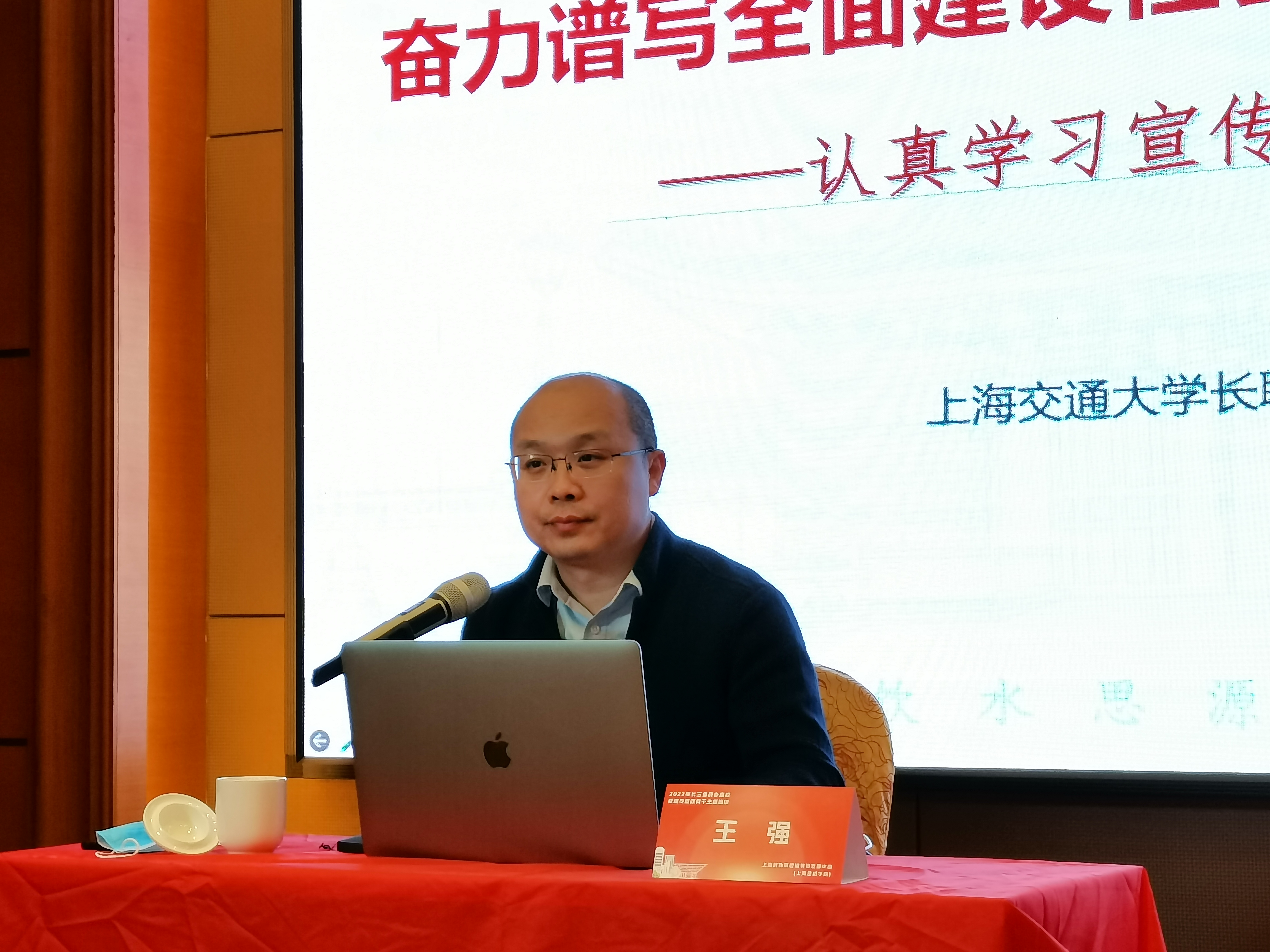 下午,中共上海市委党校王强教授作“奋力谱写全面建设社会主义现代化国家新篇章——认真学习宣传贯彻党的二十大精神”报告。他的报告分为三个部分,第一部分,十字路口,百年大变局中国式现代化的推进和拓展。在回顾了百余年来孜孜以求的“现代化的中国”奋斗目标之后,介绍了把握历史主动团结奋斗的“新时代”十年的三件大事:迎来中国共产党成立一百周年,中国特色社会主义进入新时代,完成脱贫攻坚、全面建成小康社会的历史任务,实现第一个百年奋斗目标。第二部分,战略布局,全面建设社会主义现代化国家行动纲领。他从三个方面来分析战略布局,首先,共同富裕,构建新发展格局着力推动高质量发展;其次,社会主义,坚持全过程人民民主与法治道路;再次,文化复兴,铸就自信自强社会主义文化新辉煌。第三部分,自我革命,世界上最大执政党行稳致远的独有难题。他从三个方面分析了这个难题,首先,自我革命,跳出治乱兴衰历史周期率的第二个答案;其次,把握习近平新时代中国特色社会主义思想的世界观和方法论;再次,在团结奋斗中付诸于行,见之于效,激励干部敢于担当、积极作为。