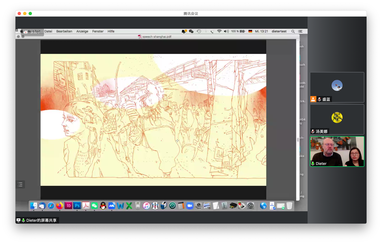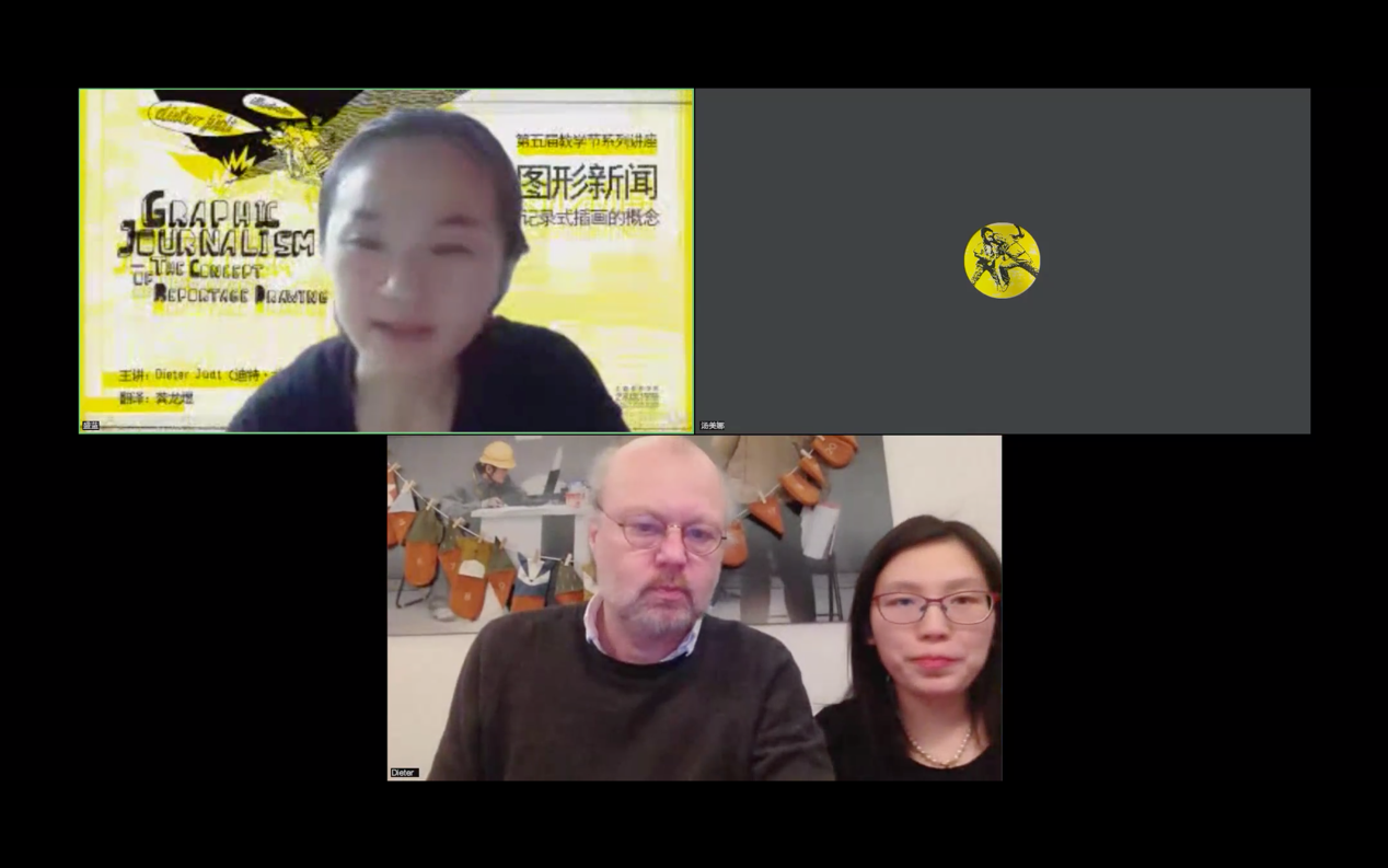 1214日,艺术设计院迎来了本届教学节系列讲座活动最后一位重磅嘉宾——德国著名插画艺术家Dieter Jüdt(迪特·尤特),远程为我院师生带来了题为“图形新闻——记录式插画的概念(Graphic Journalism—the Concept of Reportage Drawing)”的讲座,同时邀请了湖南城市学院龚龙煜老师做全场翻译。