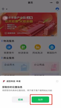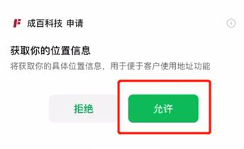 步骤二:成功通过上述两种方式进入小程序后,在系统下方会弹出“获取位置信息”申请,点击绿色的“允许”按钮。