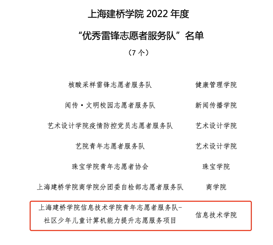 为深入学习习近平总书记对深入开展学雷锋活动的重要指示,上海建桥学院在3月4日举行“弘扬雷锋精神 培育时代新人——纪念毛泽东等老一辈革命家为雷锋同志题词六十周年”主题活动。在本次活动中,信息技术学院青年志愿者服务队——社区少年儿童计算机能力提升志愿项目被授予上海建桥学院2022年度“优秀雷锋志愿者服务队”,并被授予荣誉旗帜。