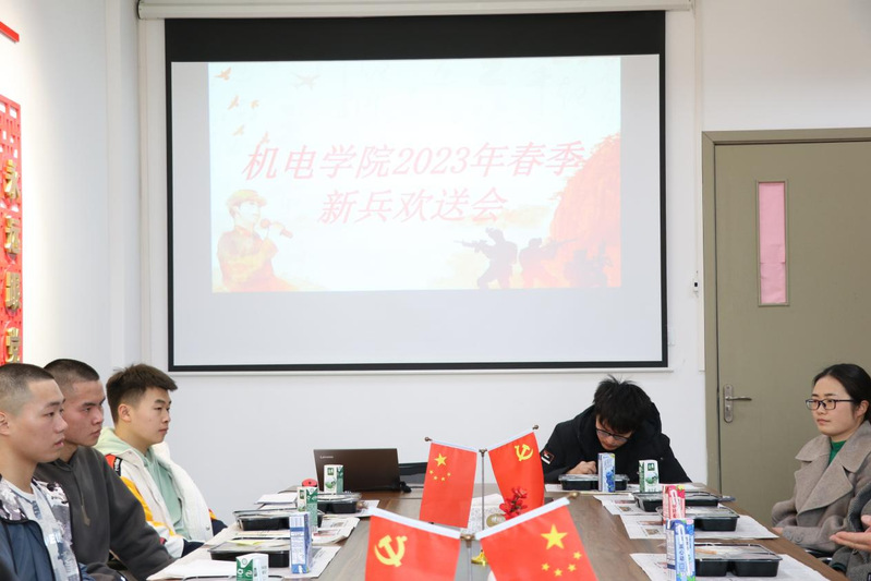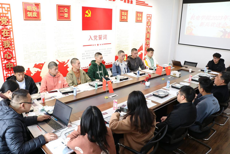 为深入贯彻新时代党的强军思想,贯彻新时代军事战略方针,引导并鼓励广大适龄青年投身绿色军营中,3月7日中午,机电学院在学院楼301党建中心举办“机电学院2023年春季新兵欢送会”,学院党委书记吴国政老师、党委副书记马秀娟老师、全体辅导员以及7名即将步入军营生活的学生参加。