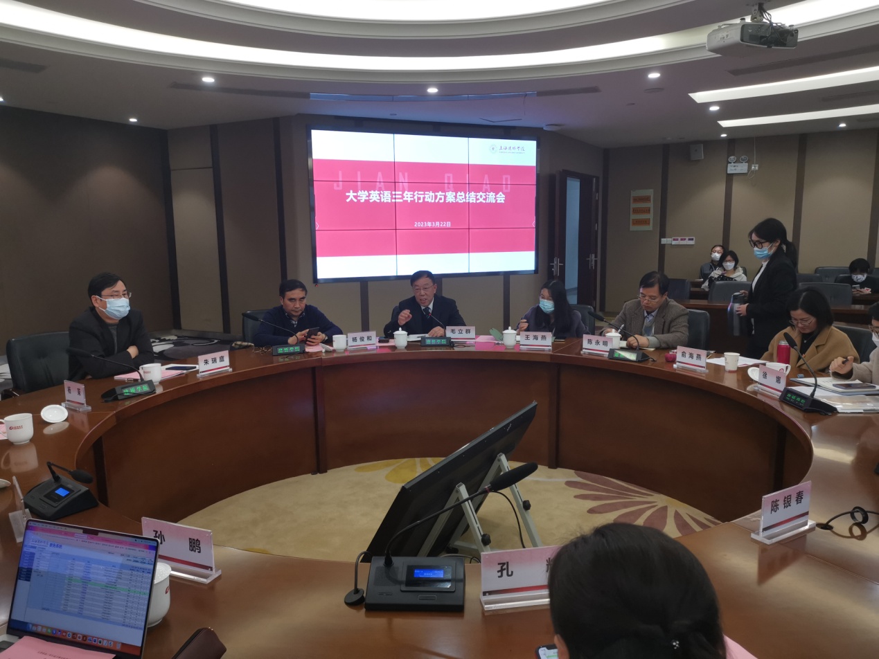 3月22日下午,我校召开了大学英语三年行动方案总结交流会。校长朱瑞庭,副校长杨俊和、外国语学院院长毛立群、教务处杨茉处长、孙鹏副处长、朱霞副处长、各学院教学副院长、各学院副书记、外国语学院班子成员以及大学英语教学部全体教师参加了会议。本次会议由杨俊和副校长主持。