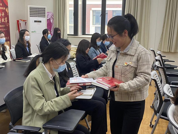 最后,学院党总支为师生们发放了《高举中国特色社会主义伟大旗帜为全面建设社会主义现代化国家而团结奋斗——在中国共产党第二十次全国代表大会上的报告》读本和学院党总支精心定制的弘扬伟大建党精神记事本。