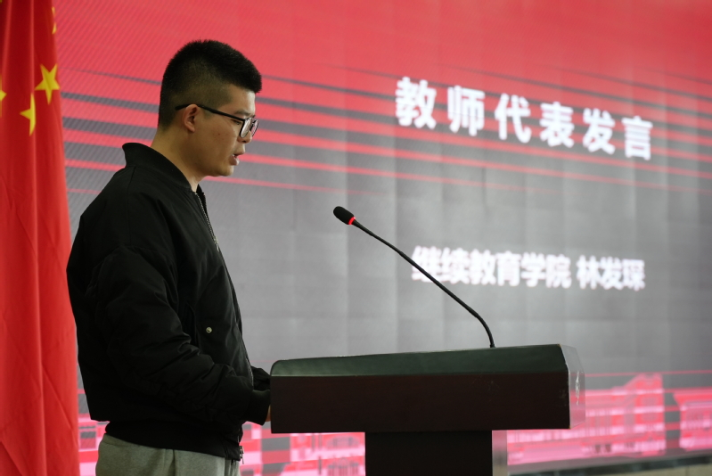 教师代表林发琛勉励同学们养成自主学习的良好习惯,理论与学习与实践联系并重,弘扬雷锋精神,奉献社会,服务人民。他殷切希望同学们不忘学习初心,牢记使命担当。作为一青年教师,将忠于职责,加强师德师风建设,教学相长,努力做好高等学历继续教育教学工作。