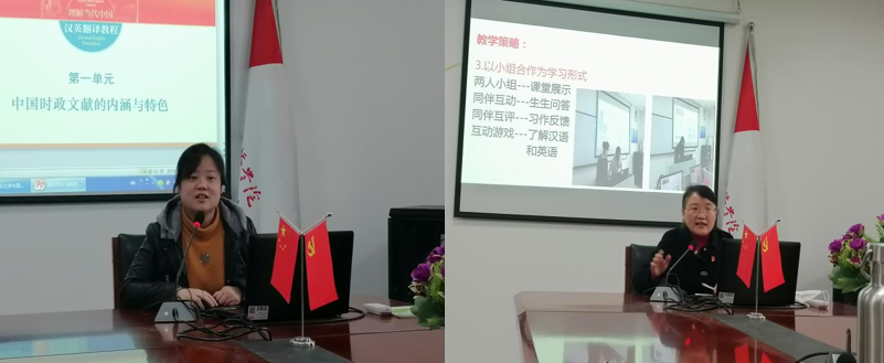 本次课程思政研讨会,支部刘晓霓、王君兰、顾君和刘海洋4位老师作为主发言人,对自己在英语教学中实施课程思政的教学策略、实施方式和存在的问题等进行了汇报和分享。刘晓霓老师对《理解当代中国汉译英翻译教程》第1单元“中国时政文献的内涵与特色”中的语言特色进行了深入分析,也提出了存在的问题和需要改进的措施:翻译案例多、语篇长、难度较大,如何提高趣味性、吸引学生投入翻译实践从而提升课程思政的成效?王君兰老师以《综合英语2》和《英语写作1》为例,介绍了课程思政的教学策略和实践情况,并反思了课程思政的教学成效,提出教师首先应该不断完善自身思想修养,提升专业水平和教学能力,同时应积极探索和实践,不断拓展课程思政建设方法和途径,提高课程思政内涵融入课堂教学的水平。顾君老师对《世界文明史》课程思政进项了分享, 强调就教学方法而言世界文明史课程中的思政,就基本教学形态来说是显性教育。任课教师在改进和创新显性教育方法的同时,应积极发展隐性教育,使显性教育与隐性教育相互补充、有机统一,把政治认同、国家意识、文化自信、人格养成等思想政治教育导向与固有的知识、技能传授有机融合。刘海洋老师对《英语报刊选读》课程思政的实施进行了分享,通过线上线下多渠道将思政元素融入教学内容,发挥课程的浸润作用,在提升学生英语技能的同时培养学生树立正确的世界观、人生观和价值观,培养学生中外文明沟通互鉴和传播中国文化的能力。