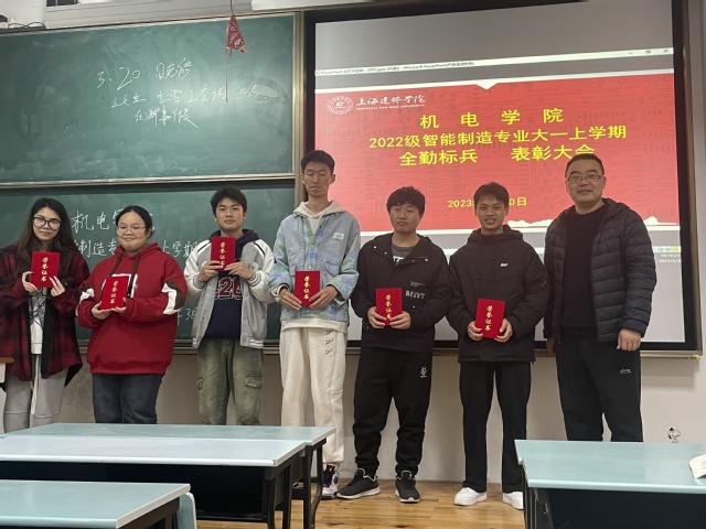 为进一步落实机电学院学风建设计划,加强班级学风建设,激励大一新生树立正确的学习目标、养成良好的学习习惯,引导学生求真务实,励志向善,培养他们自强不息、刚毅坚卓的优秀品质。近期,上海建桥学院机电学院2022级新生“全勤标兵”颁奖典礼在三教122和404教室举办。机电学院副院长都海良教授、汽车工程系系主任刘继广老师、电子工程系班导师潘铭杰老师、机电学院辅导员徐伟老师和马世超老师参加本次活动。