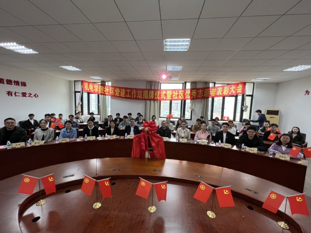 4月24日中午,机电学院党委在423会议室举行机电学院社区党建工作站揭牌仪式暨社区优秀志愿者表彰大会,出席本次活动的有学生处副处长王苇、张莉、校党委专职组织员陈静、后勤保卫处副处长郁豪庭以及处长助理吴珍珍。机电学院党委书记吴国政、副书记马秀娟以及学院全体辅导员参会。