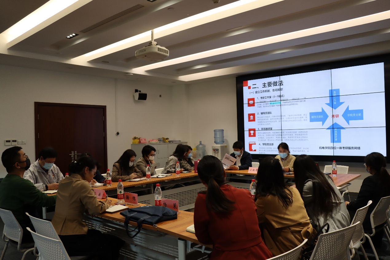 座谈会上,机电学院副书记马秀娟就本学院考研帮扶工作进行经验分享,从“建立工作机制,各司其职;建立全程体系,水滴石穿;搭建外圈资源,四方来援;重视调剂工作,争分夺秒;做好考研复盘,及时总结”五个方面,对学生进行思想指引、成才教育以及就业形势教育,调动学生考研的积极性和创造性学习的热情,激发学生考研的内在动力,尽可能地提高报考率和录取率。商学院陆军老师介绍了本学院构建的“1+1+N”考研服务模式,通过分析近三年学生的考研情况,发现工作重难点;建立了以考证考研指导中心、朋辈考研导师团和摆渡工作室为中心的三圈组织架构,从考研宣讲、经验分享和考研咨询等方面开展考研帮扶工作。学院也重视考研学生的心理健康工作,开展了考研送温暖等活动。复试阶段从导师视角给学生提供面试的指导,还包括考研调剂的方法和思路。