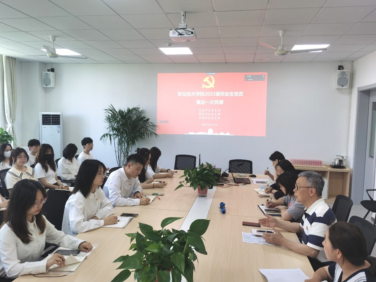 2023年6月2日,职业技术学院组织开展2023届毕业生党员最后一次党课,本次活动由职业技术学院商贸学生党支部,外语学生党支部,综合学生党支部联合举办,院党委书记王加宁、党委副书记马冯莉、组织委员廖艺晗、各学生党支部书记及全体学生党员参与。