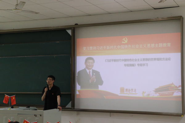 接下来,是徐光硕老师为毕业生党员带来的在校期间最后一节党课。徐老师以深入学习《习近平新时代中国特色社会主义思想的世界观和方法论专题摘编》 为主题并讲到:新时代我们要谱写马克思主义中国化时代化新篇章;坚持把马克思主义基本原理同中国具体实际相结合、同中华优秀传统文化相结合;把握好新时代中国特色社会主义思想的世界观和方法论,坚持好、运用好贯穿其中的立场观点方法。他要求学生党员要坚持深入学习理论知识,继续秉承全心全意为人民服务的宗旨,勇担时代责任和使命,为实现中华民族伟大复兴的中国梦而不懈奋斗。