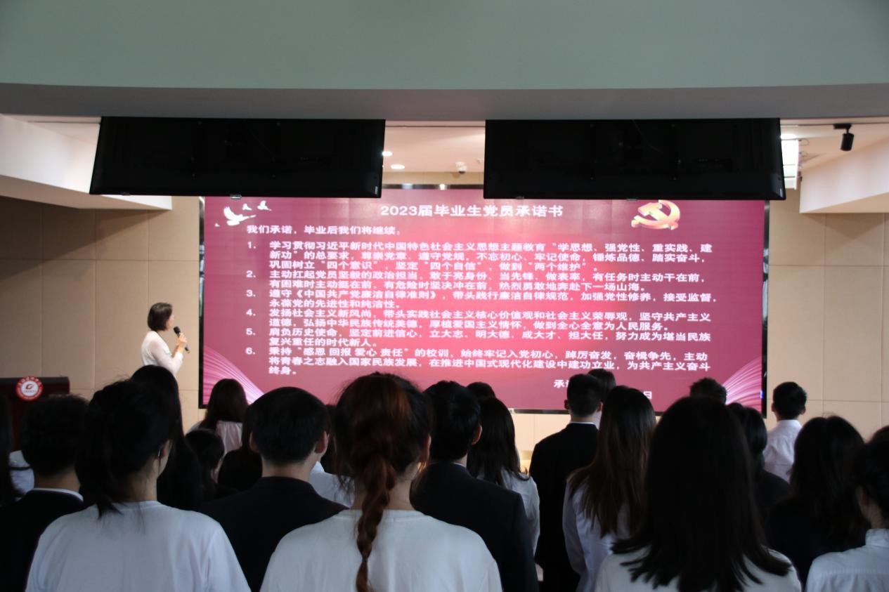 党委副书记伊莉带领外国语学院 2023 届全体毕业生党员宣读党员承诺书并做出承诺。全体毕业生党员将坚持以习近平新时代中国特色社会主义思想为指导, 厚植爱国主义情怀,肩负历史使命,坚定前进信心,秉承校训、恪守自己的承诺, 站好“最后一班岗”,有序完成毕业生党员离校工作。