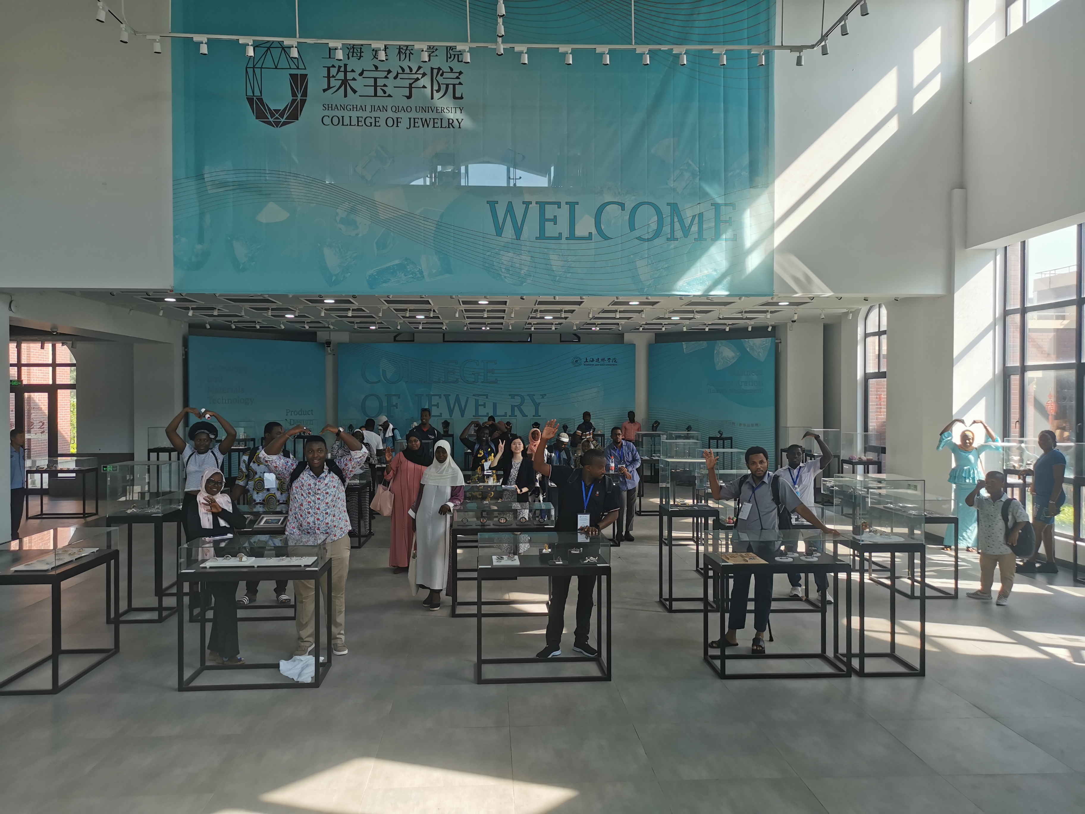 会后,冈比亚信息技术应用能力建设研修班一行还实地参观了信息技术学院数字媒体技术专业实验室和珠宝学院展厅。研修班学员们现场体验VR虚拟现实设备,切实感受物联传感、人机交互的魅力。他们对美丽的校园风光、优秀的学生毕业作品和先进的实训设备赞叹不已,在每一个地方都驻足留恋。