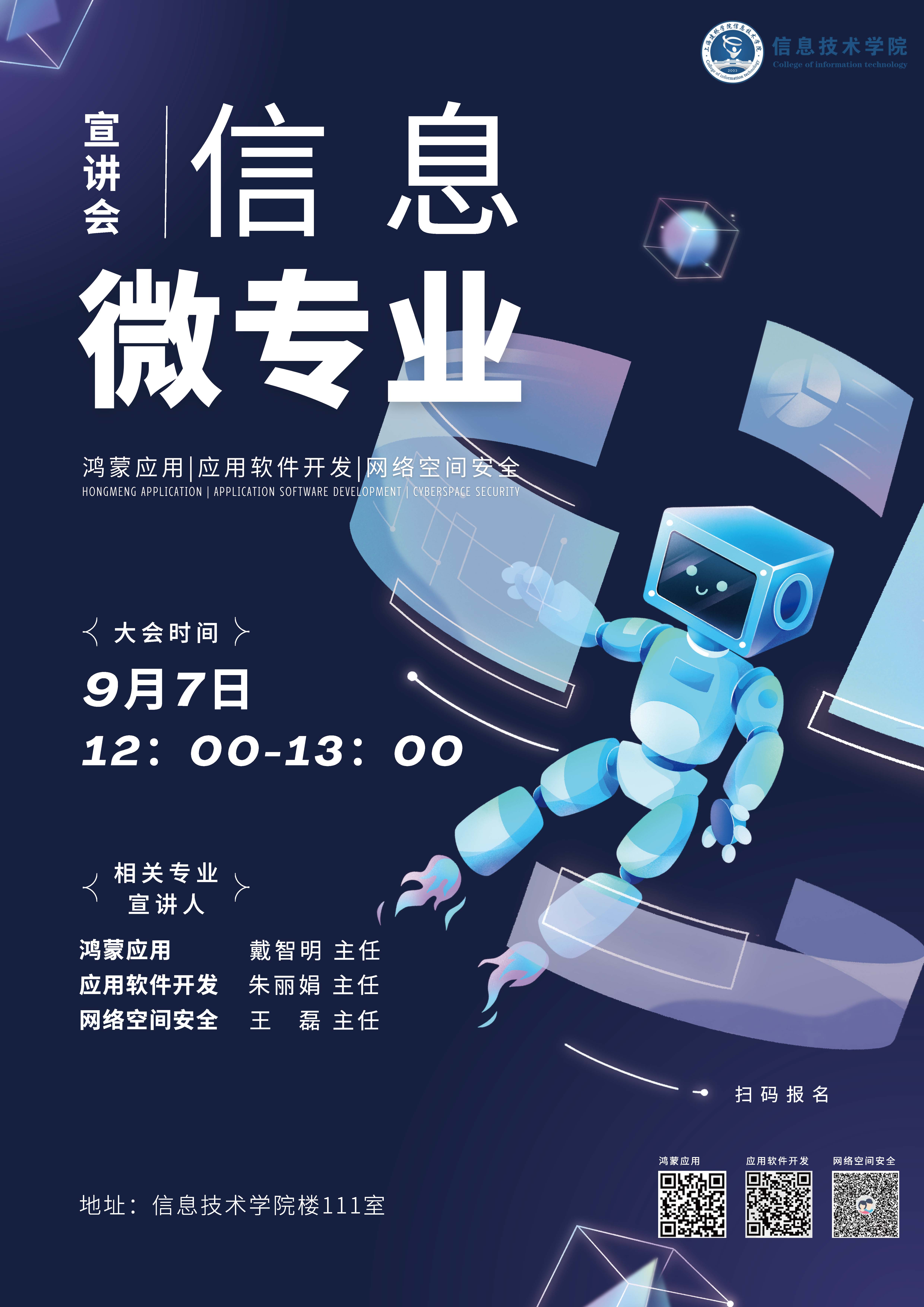 信息技术学院微专业宣讲会将在本周四中午12:00-13:00在信息技术学院楼111室开展,届时将会有专业负责人及学院领导详细介绍“鸿蒙应用”“网络空间安全”和“应用软件开发”三个专业的情况,希望各位老师同学积极参加了解。