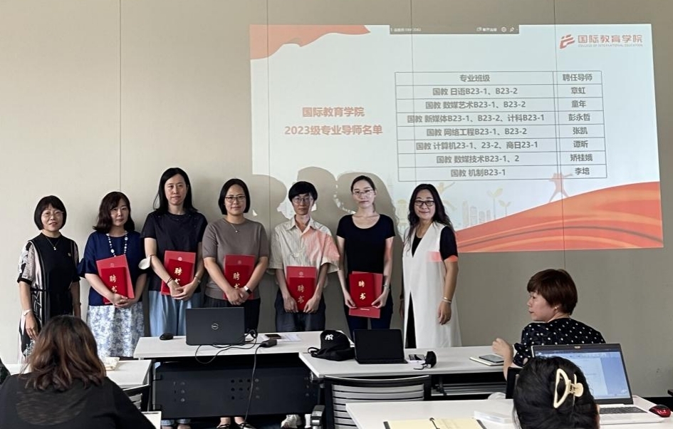 第二项议程,举行了学院2023级专业导师聘任仪式,由梁月泉院长和周英芬书记为章虹、童年、彭永哲、张凯、谭昕等7位2023级专业导师颁发聘书。