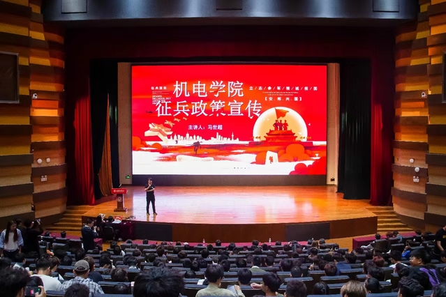 为深入贯彻新时代党的强军思想,落实新时代军事战略方针,引导并鼓励广大适龄青年投身绿色军营中,10月12日,机电学院在大礼堂举办了2023级新生入学教育之征兵政策宣传活动,马世超老师担任本次活动的主讲人,全体2023级新生及新生辅导员参加。
