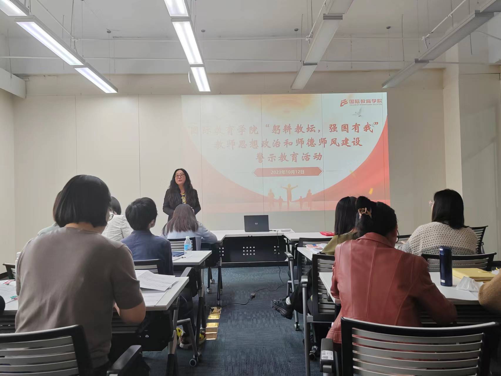 10月12日下午,国际教育学院在学院四楼会议室召开“躬耕教坛,强国有我”教师思想政治和师德师风建设警示教育活动,会议由学院党总支书记周英芬主持,学院全体教职工参加会议。