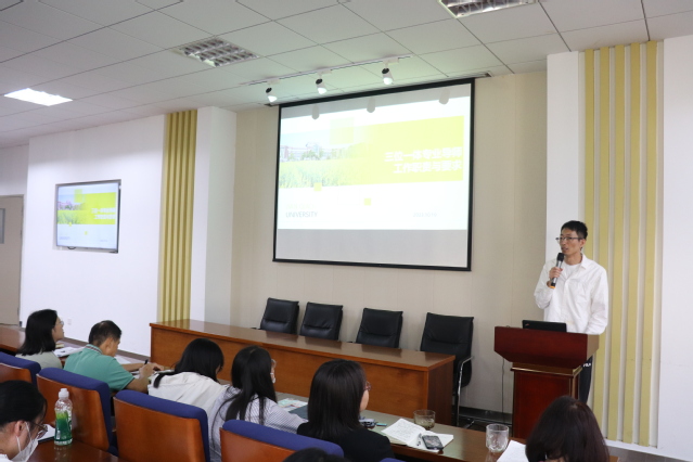 商学院办公室主任徐光硕具体介绍了专业导师“三位一体”实施方案,专业导师工作职责和要求等,并代表学院期望各位专业导师能通过这个模式激发学生对专业学习的兴趣,做学生的良师益友。