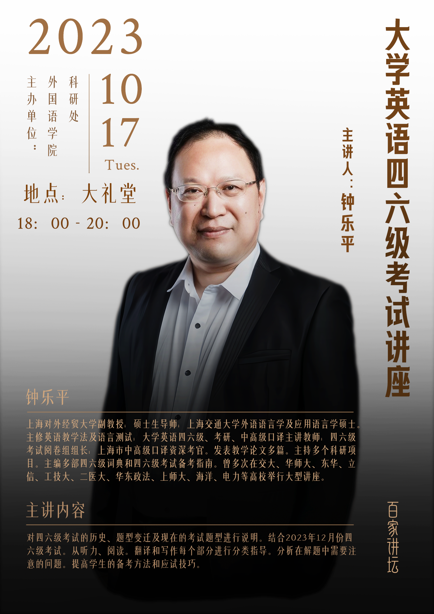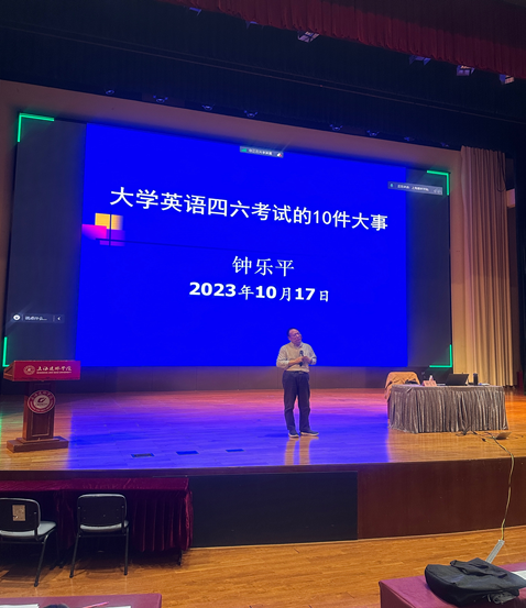 为切实加强我校学风建设,营造浓厚的学习氛围,帮助学生提升大学英语四、六级考试答题技巧,更有针对性地迎接即将到来的12月16日的大学英语四、六级考试,进而提升我校四级通过率,10月17日晚18点,科研处与外国语学院在大礼堂联合举办了“大学英语四六级考试讲座”,吸引了全校各个学院学生前来听讲。此次讲座由大英部主任孔辉老师主持,上海对外经贸大学钟乐平副教授主讲。大英部的傅荣琳、谭湘蓉、刘忠杰、王颖、黄莉岚、郑琳等老师也参与了本次讲座。