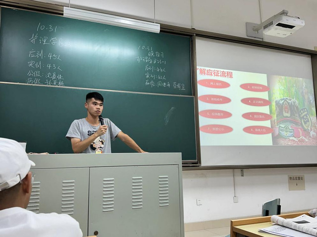 为贯彻习近平新时代中国特色社会主义强军思想,培养当代大学生国防观念和国家情怀,健康管理学院于2023年10月31日,由院征兵负责人卞浩老师与学院退伍复学老兵,利用晚自习的时间,就大学生入伍征兵进行宣讲、对入伍政策展开具体讲解,以此来激发学生们从军入伍的意愿,以热血青春报效祖国的激情。