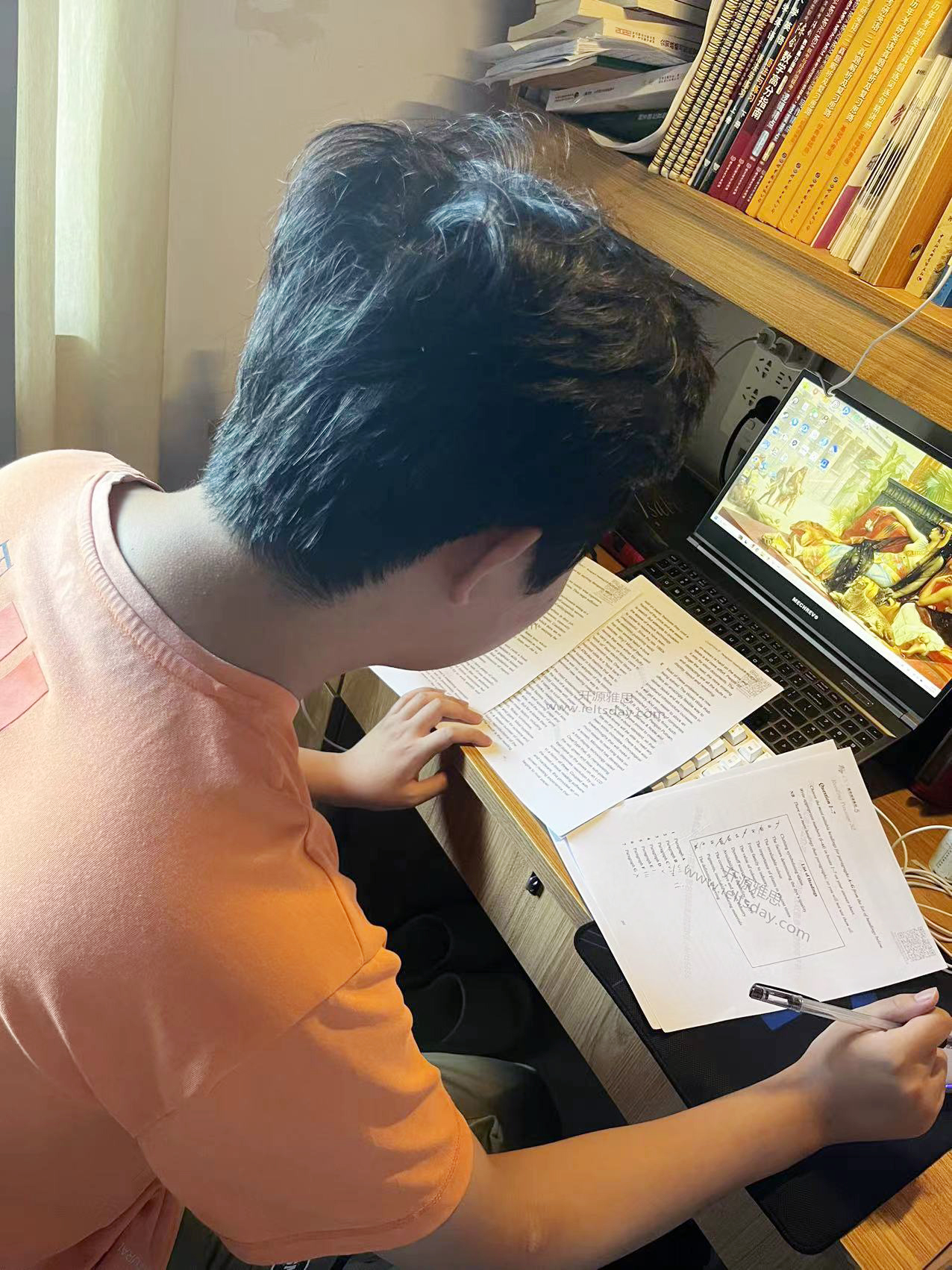 张奕杰始终相信熟能生巧,笨鸟先飞。没有老师,毅力就是最好的老师。在备考的六个月里,他没有放过任何闲暇时间,满脑子想的都是“一定要努力”。他每天坚持背诵两百个单词,做一套听力和阅读,自行批改、订正、复盘,找出问题所在。