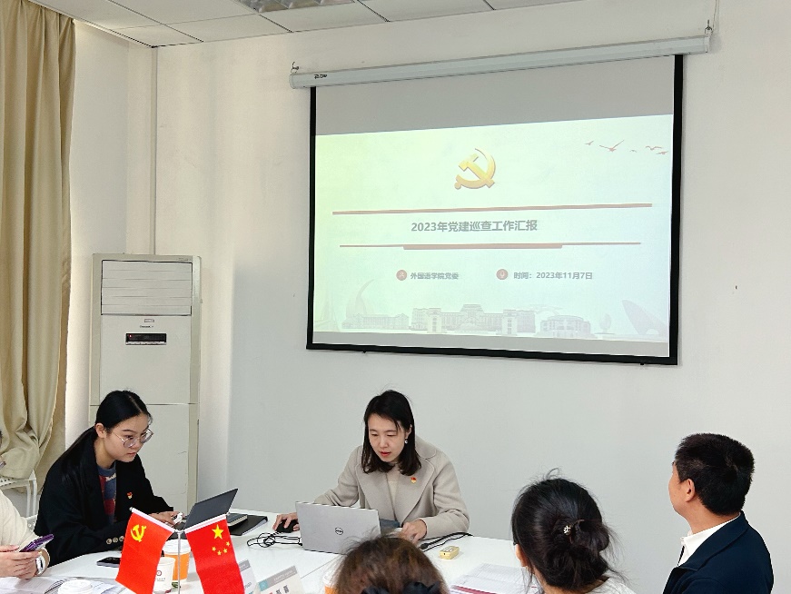 2023年11月7日上午,副校长俞晓光,教育部高校思想政治工作创新发展中心副主任胡家俊,组织部副部长、教师工作部副部长黄晓星,统战部副部长、纪检办公室副主任潘明芸,组织部专职组织员陈静,组织部干事张梦媛一行赴外国语学院开展基层党建巡查工作,学院党委委员以及各党支部书记参加本次党建巡查会议,学院党委书记杜鹃主持会议。