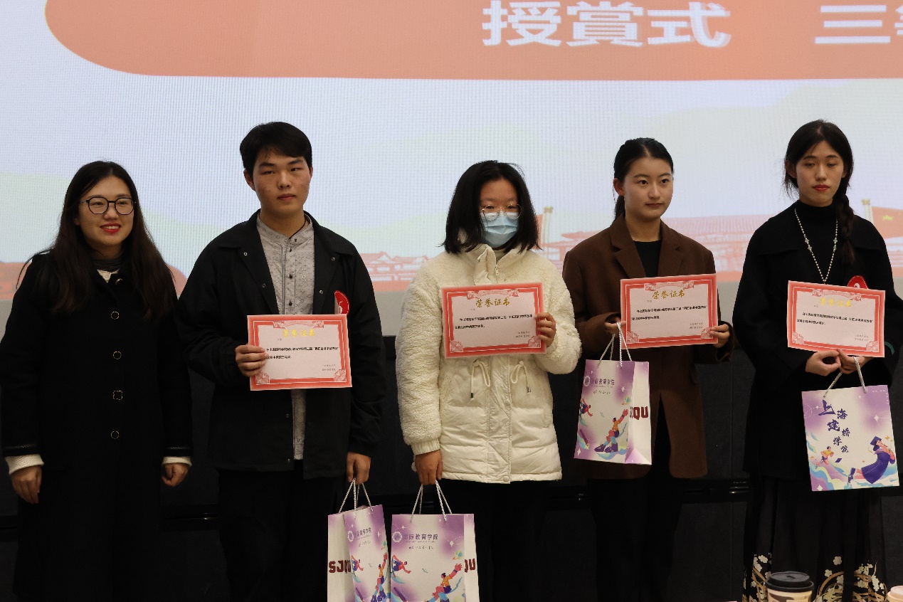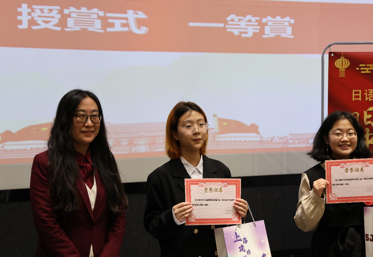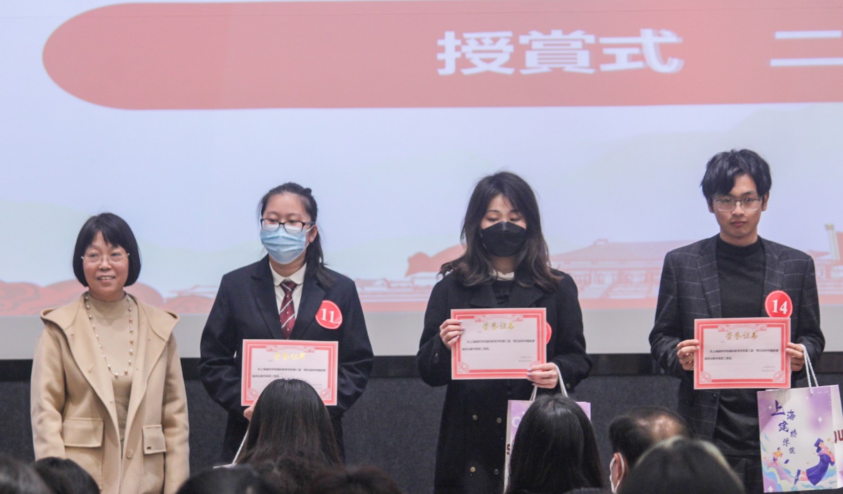 比赛环节,16名选手们精神饱满、热情洋溢,语言流畅、声情并茂地讲述了绚丽的中华文化和伟大中国精神。演讲主题丰富广泛,有展现中国传统故事的《愚公移山》、《花木兰》,有代表中国发展速度的中国铁路、航天科技,还有讲述了共产党员的感人事迹等。经过激烈的角逐,日语B22-1张蕴蕾、日语B23-1许欣怡获得一等奖;日语B21-2徐复兴、日语B22-1王樱霖、数艺B22-1陆涛获得二等奖;日语B22-1宋艾嘉、网媒B23-1周文琪、网媒B23-2邵瑞翔、商日21-1庄晴逸获得三等奖。