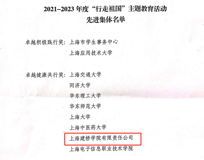 近日,上海市教委发布《上海市教育委员会关于公布2021-2023年度“行走祖国”主题教育活动先进集体名单的通知》(沪教委学〔2023〕59号),上海建桥学院荣获“卓越健康共行奖”称号。