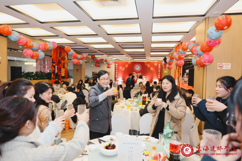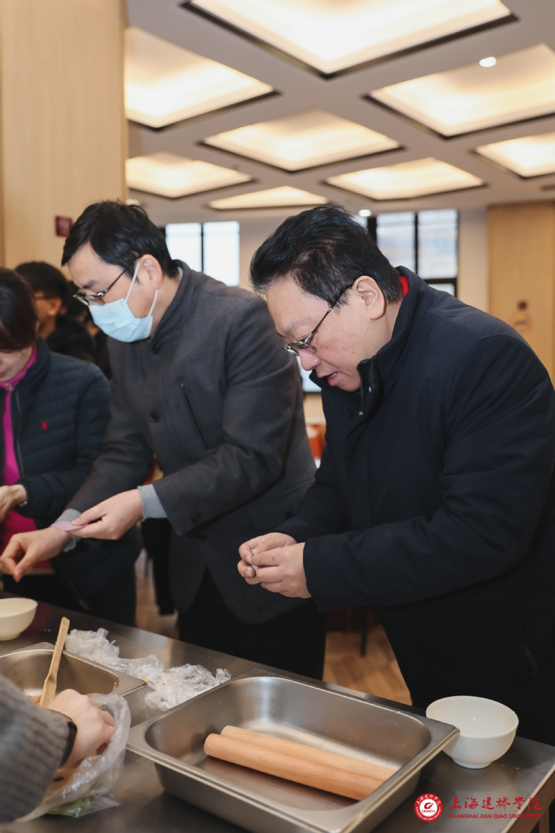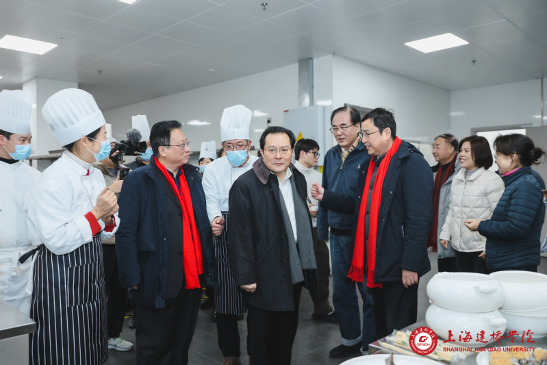 玉兔载誉辞旧岁,金龙报喜闹新春。2024年2月3日(农历腊月二十四),是中国传统的南方小年,上海建桥学院举行了一场别开生面的迎春年夜饭活动。市教卫工作党委书记沈炜、市教委学生处处长丁良一行专程到校检查指导工作,并与寒假留校学子一起欢欢喜喜过年。校长朱瑞庭、校党委书记杨伟人、原校党委书记江彦桥等校领导,各二级学院及职能部门相关负责人,以及留校教职工代表和我校寒假留校学生等100余人欢聚一堂,共吃年夜饭。校领导亲自掌勺,为留校学子做年夜饭,在欢声笑语中共同企盼甲辰龙年的到来。