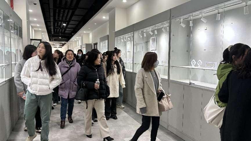 来宾们到达后,先参观了珠宝学院楼。大家对展厅内的学生毕业设计作品赞誉不绝,并对学院各专业实验室产生了浓厚兴趣,流连其间。