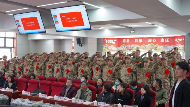 在陈校长的倡议下,全体预定新兵向学校和父母庄严承诺:不负期望,严格自律,忠诚履职,报效祖国。