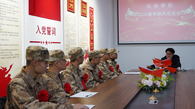 自2024年春季征兵动员会以来,在机电学院党委广宣传、细排摸、强动员的系统部署下,经过层层筛选,我院最终有6名学生成为应征入伍新兵。3月12日,机电学院在学院楼301党建中心召开2024年春季新兵欢送会,机电学院党委书记吴国政、党委副书记马秀娟、学院全体辅导员以及6名入伍新兵出席会议。